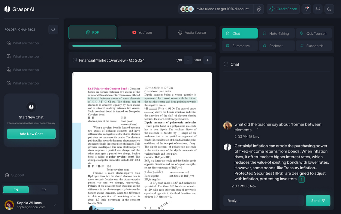 L’outil permet notamment de discuter avec un PDF, de retrouver rapidement une information, de valider l’exactitude d’une mention grâce à des références cliquables et de bonifier la prise de notes. Il propose aussi des fonctionnalités qui accélèrent la maîtrise du contenu, comme la génération de quiz et de cartes mémoire, la création de résumés interactifs, ainsi que des explications instantanées à partir d’un passage surligné. Pour Yann-Sibril, l’avenir de l’apprentissage passera tôt ou tard par une IA qui guidera, organisera et aidera à comprendre un sujet en profondeur grâce à l’interaction.